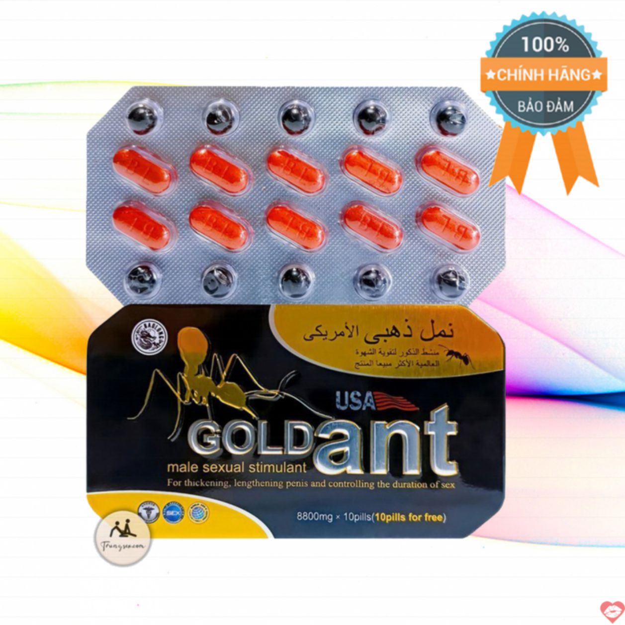 Mỗi hộp Gold Ant USA thanh toán được thiết kế gồm 1 vỉ thuốc có 20 viên thuốc trong đó có 10 viên thuốc màu đỏ địa chỉ và 10 viên thuốc nhỏ tròn thế giới được sử dụng giảm giá như sau: